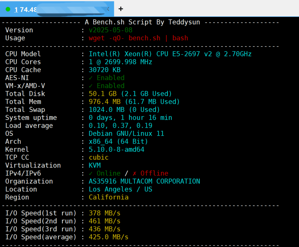 CloudCone推出网络星期一特价美国VPS,年付$9.99起,可选洛杉矶、雷斯顿、圣路易斯三地,KVM虚拟化,1Gbps带宽,含IPv4,支持PayPal。本文主要简单测试$9.99/年 特价机。