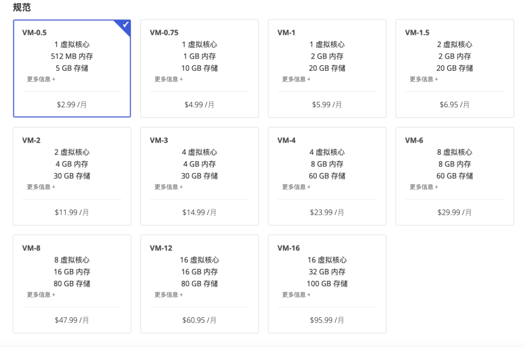 VM-0.5 1 虚拟核心;512 MB 内存;5 GB 存储;✓ 250 GB 每月流量分配;✓ 1 Gbps 端口速度 价格:$2.99 /月